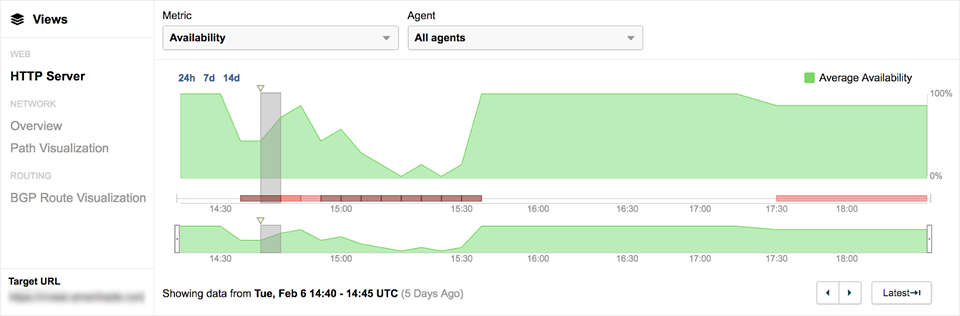 Using this more penetrating level of visibility, let’s take a look at how one major online trading site was behaving on the morning of Tuesday, February 6th — the day after the big drop in the Dow. At 16:30 UTC or 9:30am eastern time — the start of trading hours, this online trading website starting experiencing serious drops in HTTP availability for over an hour, as seen in Figure 2: