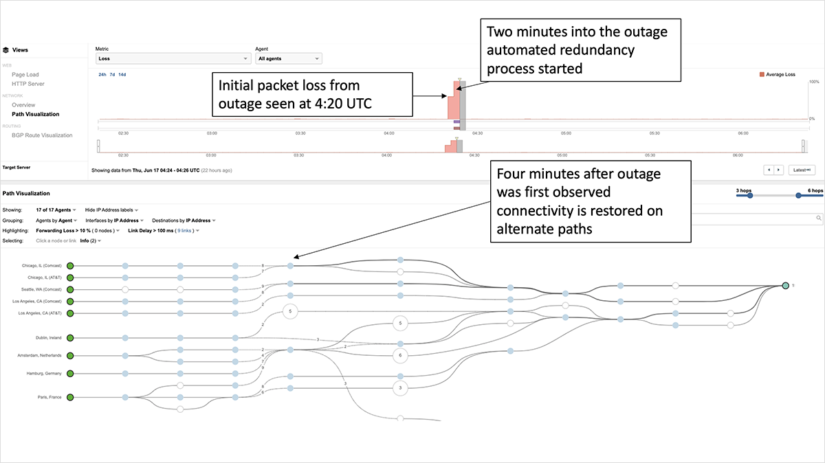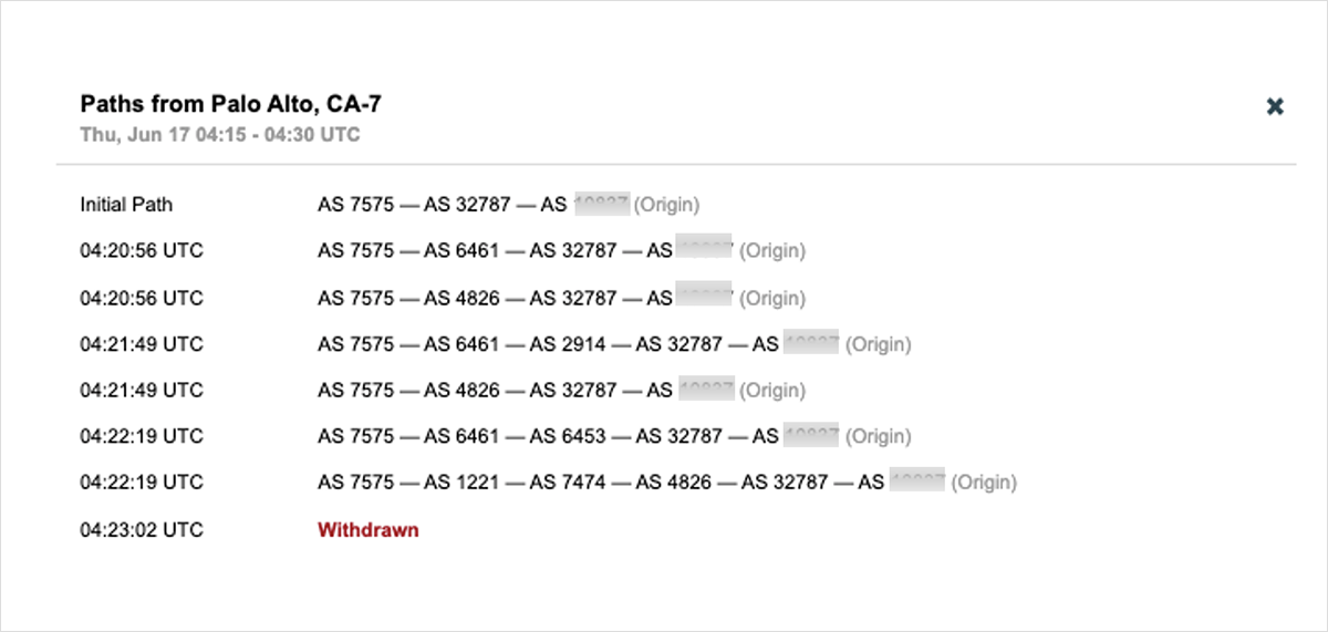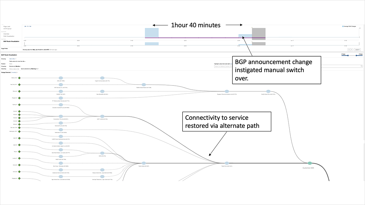 In comparison, organizations that relied on manual intervention took longer to propagate the changes needed to re-establish connectivity via alternate paths. For example, a financial service based in Australia was impacted for approximately an hour and forty minutes. Ultimately, it was able to recover connectivity to its service by readvertising its affected prefix via an alternate service provider.