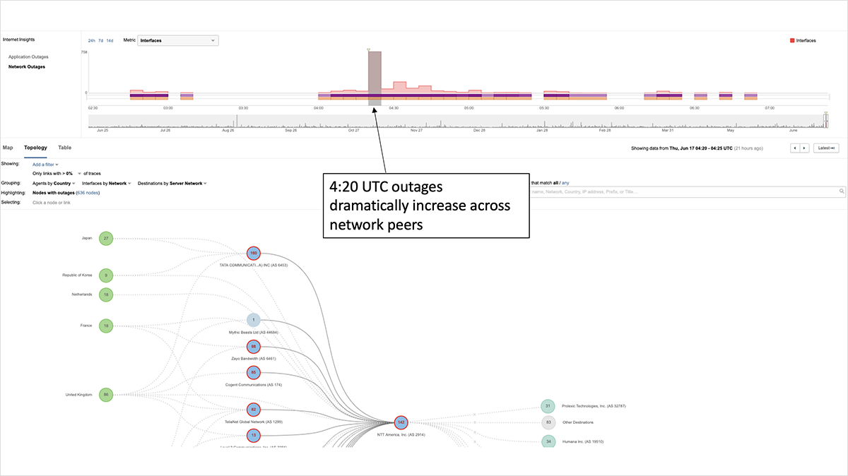 Beginning at 4:20 UTC June 17 (9:20 PM PDT June 16), Akamai’s DDoS mitigation service, Prolexic Routed, experienced a service disruption that rendered some of its customers’ websites unreachable for varying lengths of time — some just minutes, others longer. At that time, ThousandEyes observed a notable surge in network outages, as service providers peering with Prolexic lost their connections to the service, resulting in 100% traffic loss.