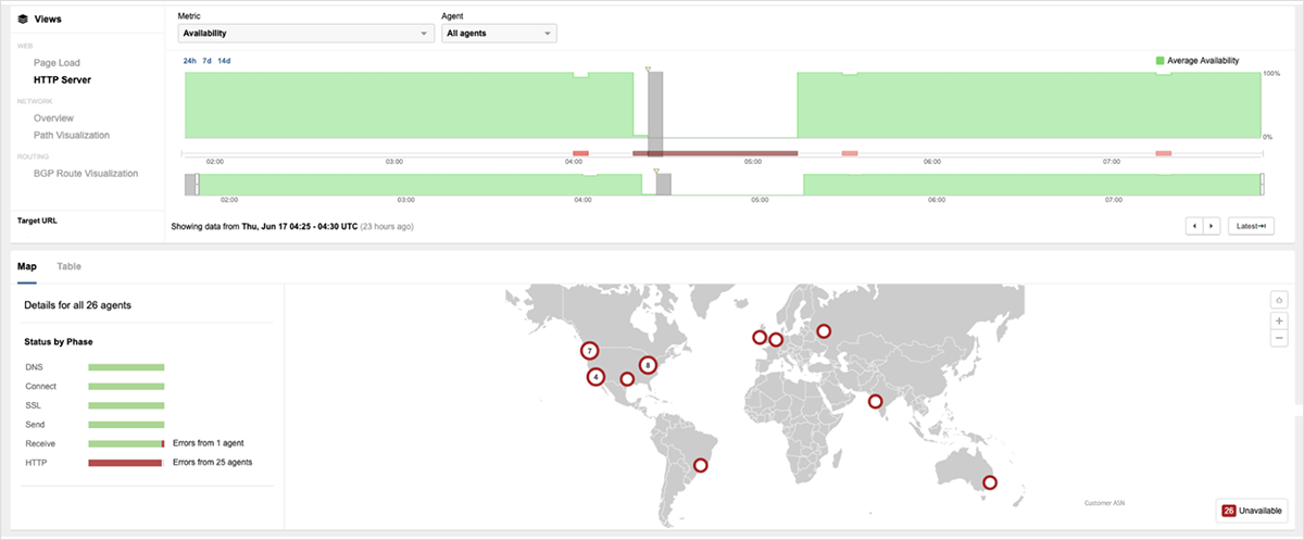 In Akamai’s statement announcing service restoration, it noted that the outage was not due to either a system update or cyber attack but instead by inadvertently exceeding a routing table value used by the service. This is consistent with ThousandEyes’ observation of the incident, in which we saw a total loss in reachability of the service. In the event of a DDoS attack, the DDoS mitigation service would still be in the BGP path to sites under attack as it worked to absorb the malicious traffic. This was the case when Prolexic successfully defended Github from the largest recorded DDoS attack in Internet history.