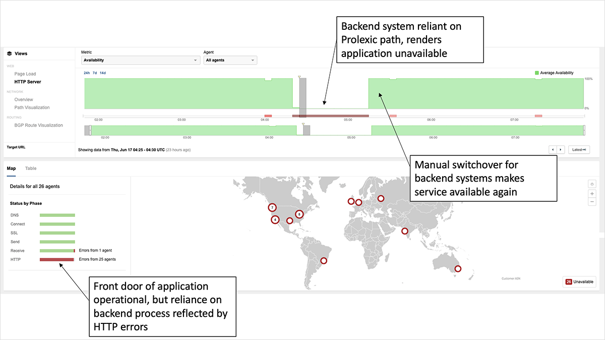 Not every impacted customer lost connectivity to its service front door. The organization shown in figure 5 uses Akamai’s CDN service, which was reachable throughout the Prolexic outage. However, requests for the site were returning 503 errors starting at 4:20 UTC, as a backend system critical to loading the page was unavailable, as it was sitting behind the Prolexic service. Most sites today have many backend and even third-party dependencies that are not visible via the front door, so the broader impact of outage likely went beyond its direct customers. Any lack of visibility into all associated dependencies potentially meant that some organizations were not immediately aware they were impacted and, as a result, took longer to both identify and fix the issue.