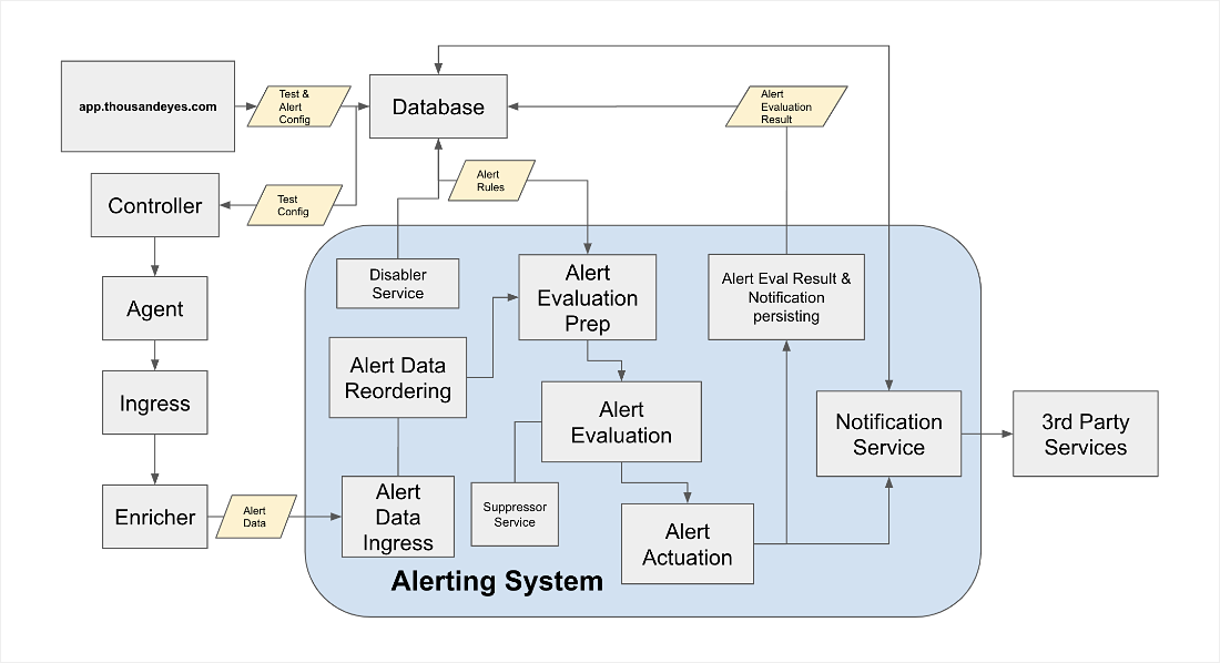 At ThousandEyes, we’re on a mission to increase your visibility into the network. However, sometimes the network experiences issues when you’re not looking. That’s where alerting comes in! Our purpose-built alerting system is the ever-vigilant watchers on the walls, ensuring you’re made aware of anomalies as soon as they happen. On the surface, all you need to do is instruct our platform on what kinds of situations to look for in your monitoring data (for example, if your network experiences latency or your application availability drops below a certain threshold) and how we should notify you if such situations are detected. Underneath the surface though, there’s a lot that goes on to ensure this process works reliably and efficiently, at internet-scale. In this blog post, we’ll provide a high-level overview of how this process works, along with the basic concepts that the alerting system is built around.