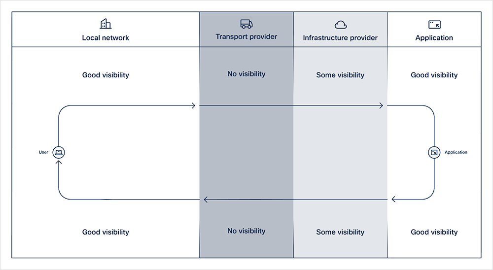 The diagram in Figure 2 below illustrates a campus or enterprise user’s access to an application controlled by the same enterprise, whether on-prem or cloud-hosted, and highlights the varying amounts of access to the equipment. In this scenario, there is access to the infrastructure and software at both the source network and at the application target, with one or more middlemen handling some aspect of the delivery. This is the best-case scenario. Third-party and SaaS applications reduce this visibility considerably at the target side. Some SaaS solutions offer visibility delivered to authenticated customers through proprietary web tools or their APIs, while others provide little to none.