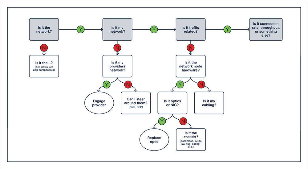 From there, we know who to engage to help with the necessary investigation, workaround, and resolution. The subsequent investigation ideally helps to fully understand the trigger and the resulting behavior. And this also tells us: Is it the network? Or, is it the application? Or even, is it a reliant service such as DNS, SSL, or some other third-party service?