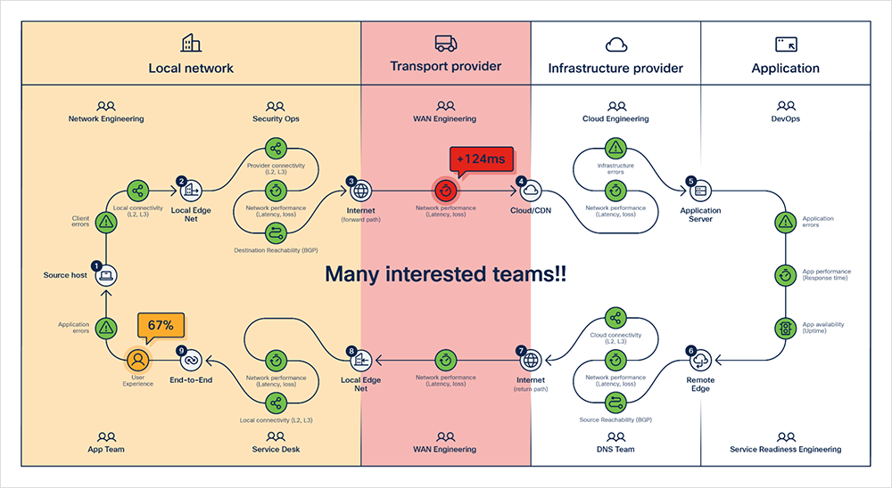Network teams work diligently on delivering the network services as expected. Many other teams are involved in delivering the tasks and services needed to assure that the digital service is performing per expectations. While these two core objectives are distinct and separate, they intersect in many use cases, such as digital performance investigations and in each team’s knowing that the part they play in the end-to-end performance is healthy.