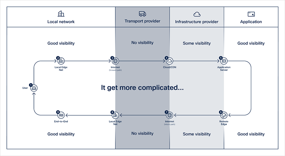 With some of these domains, there will be plenty of visibility. There will be rich and numerous metrics, and administrative access to the gear. Other domains, such as public cloud infrastructure or CDNs, offer some visibility but markedly less than that within one’s own network or data center. And then others, such as the Internet, are a black box.
