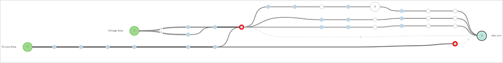 The path visualization shows certain locations were unable to reach Okta during the outage. However, it is important to mention that not all of Okta’s servers were impacted as only those residing in the AWS US-EAST-2 AZ1 network were affected by the power outage. For the tests that did fail, ThousandEyes observed connection failures and SSL and HTTP errors.