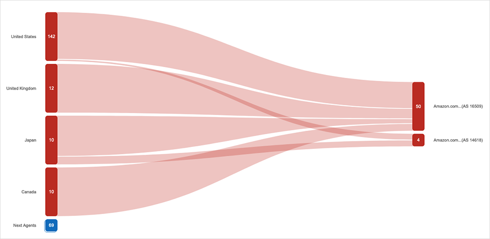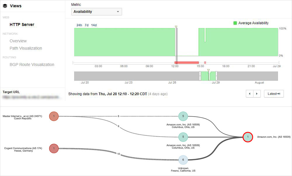 Shortly after the start of the incident, ThousandEyes observed a spike in both application and network outages corresponding with the AWS power outage. Applications hosted on AWS started to see an increase in application errors and, simultaneously, traffic loss was observed on routers in the AWS network (AS 16509 and AS 14618) located in Columbus, OH (see Figure 1 and Figure 2 below).