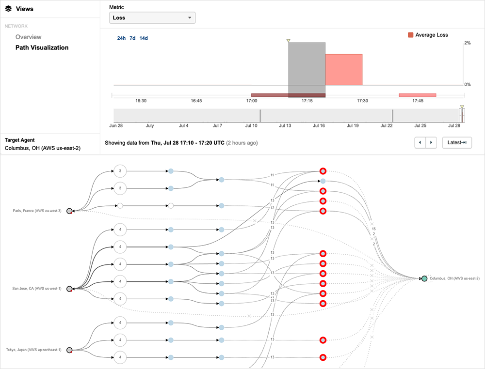 A good look at the impact can be seen at around 17:10 UTC, with several ThousandEyes vantage points located in various AWS regions around the world showing failures connecting to a ThousandEyes vantage point in Columbus, OH, located in the AWS US-EAST-2 AZ1 data center.