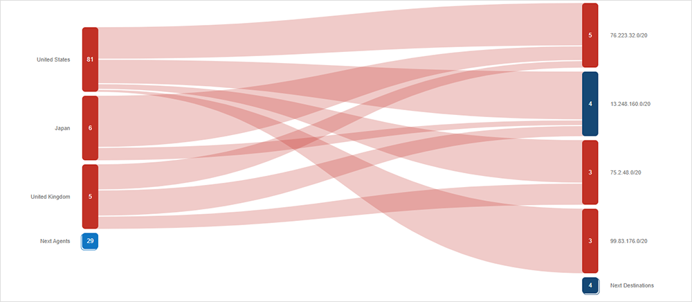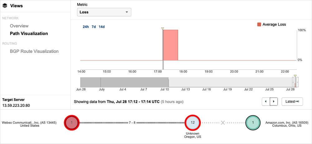 In Figure 6, we can see how Webex (AS 13445) was unable to communicate with the server hosted on AWS (AS 16509). We can see that for the Columbus, OH, location the test result was presenting 100% packet loss.
