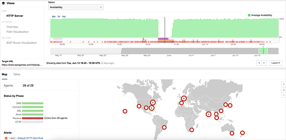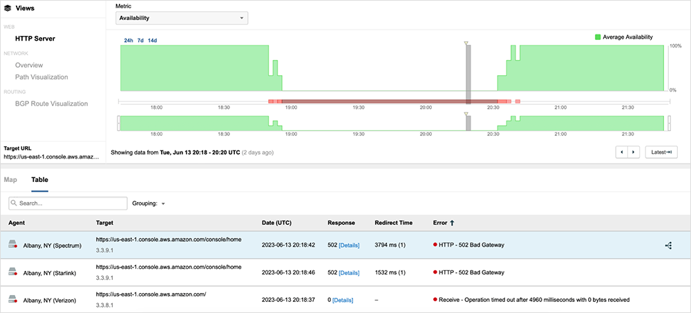 ThousandEyes actively monitors the reachability and performance of thousands of services and networks across the global Internet, which we use to analyze outages and other incidents. The following analysis of AWS’ US-EAST-1 service disruption on June 13, 2023, is based on our extensive monitoring, as well as ThousandEyes’ global outage detection product, Internet Insights.