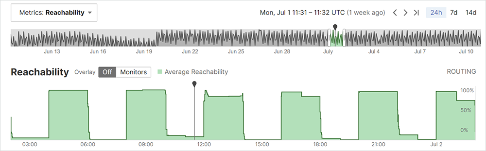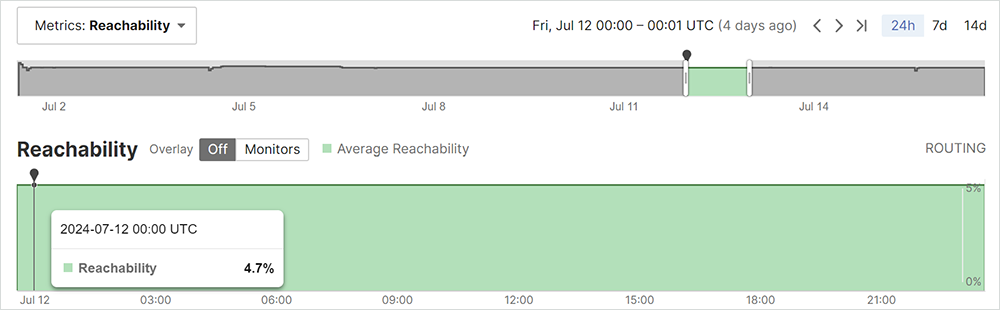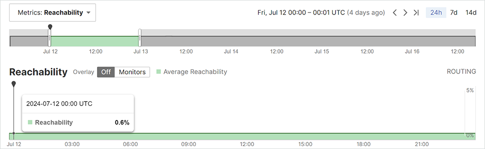 RIPE routing beacons are IPv4/IPv6 prefixes that are announced every four hours by specific RIPE Routing Information Service (RIS) collectors and are withdrawn two hours after each announcement. The Cisco ThousandEyes platform tracks the reachability of configured prefix targets over time. Using Cisco ThousandEyes, we illustrate the reachability of RIPE beacon prefixes. Figure 2 depicts this for the prefix 2001:7fb:fe01::/48 on 2024-07-01. Although the prefix is withdrawn during the pinpointed interval, its reachability does not drop to 0%; instead, it drops to 5.7% as three monitors do not send any withdrawals for the prefix.