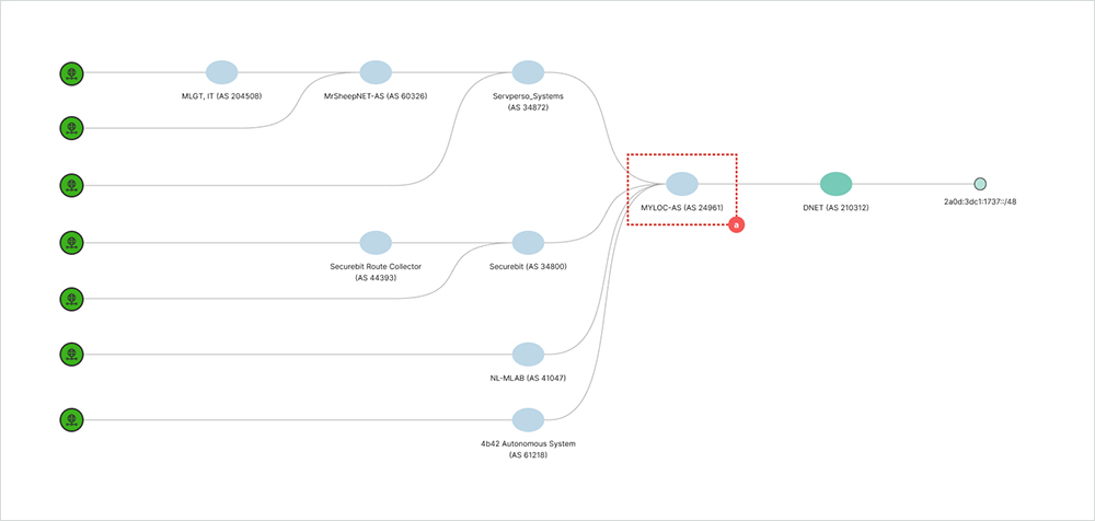 - A Tier 2 ISP in Germany: Our beacon prefix 2a0d:3dc1:1737::/48 remained in the RIBs of seven peer routers from seven peer ASes, which shared the common subpath “24961 210312”. This indicates that AS24961 (WIIT AG, DE), a Tier 2 ISP in Germany with approximately 200 ASes in its customer cone, could be the root cause of the Zombie outbreak. We visualize the Zombie AS paths and highlight the possible root cause AS (a) in Figure 5.