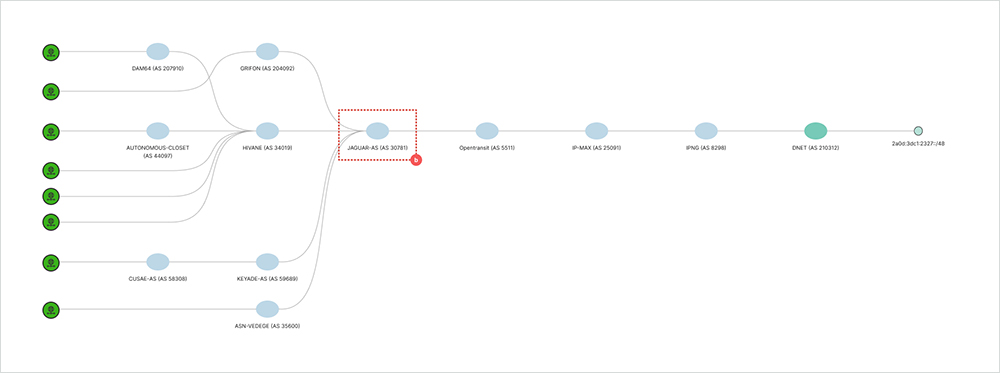 - A Tier 2 ISP in France: Our beacon prefix 2a0d:3dc1:2327::/48 remained in the RIBs of eight RIPE RIS peer routers from six peer ASes, which shared the common subpath “30781 5511 25091 8298 210312”. This indicates that AS30781 (Free Pro SAS, FR), a Tier 2 ISP in France with approximately 200 ASes in its customer cone, could be the root cause of the Zombie outbreak. We visualize the Zombie AS paths and highlight the possible root cause AS (b) in Figure 3.