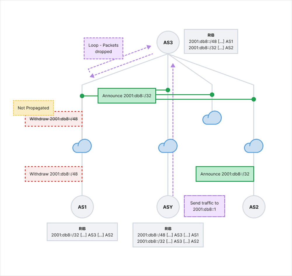 For example, if a user within ASY starts sending traffic towards the IP address 2001:db8::1, due to the Longest Prefix Match (LPM) strategy implemented by routers, the traffic will be forwarded along the path ASY [...] AS3 [...] AS1. However, the AS following AS3 (left branch) has only the route towards the prefix 2001:db8::/32, and therefore, when the traffic reaches it, it will forward it back to AS3, creating a loop. Eventually, the routers will drop the packets when they decrement the IPv4 Time to Live field to zero.
