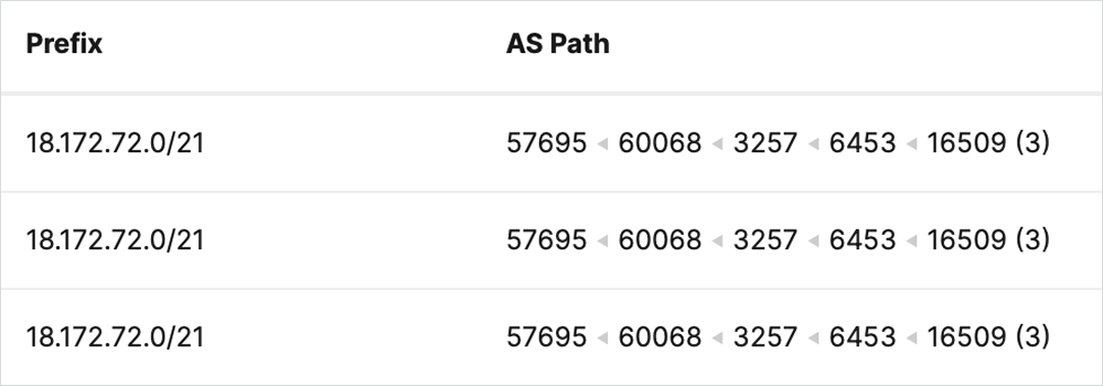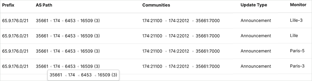 BGP Communities are widely used to enforce routing policies and provide valuable network insights. Figure 5 shows that the prefix 65.9.176.0/21 has been tagged with a few BGP Communities. The community 35661:7000 indicates the route is learned through peering in Paris with AS35661. Communities 174:22012 and 174:21100 respectively indicate the route is learned in the U.K. and from a non-customer in Europe through peering with AS174. Furthermore, the AS Path shows that AS16509 is prepended three times.