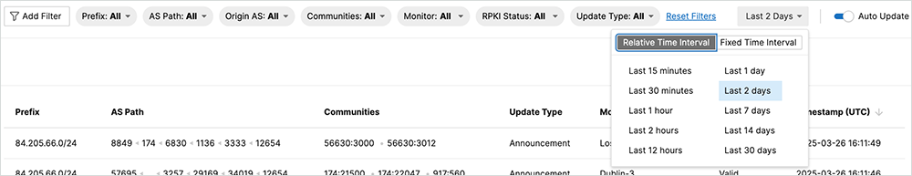 Figure 3 illustrates various filters that allow users to refine their data set. For example, to view only RPKI invalid announcements, users might select that category under the RPKI Status filter. A date selector enables them to examine messages that arrived around a specific event within the last 30 days. Additionally, an Auto Update toggle on the right can pause incoming streaming messages to facilitate point-in-time analysis.