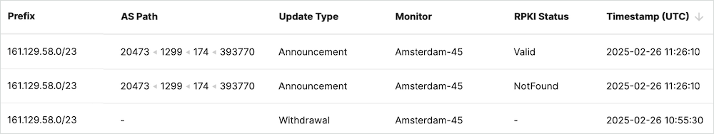 Given the high stakes involved in RPKI errors, verification is crucial. The BGP Updates feature provides real-time visibility into RPKI status from hundreds of BGP monitors, helping operators confirm how their prefixes are propagating and verify that RPKI configurations are correct.