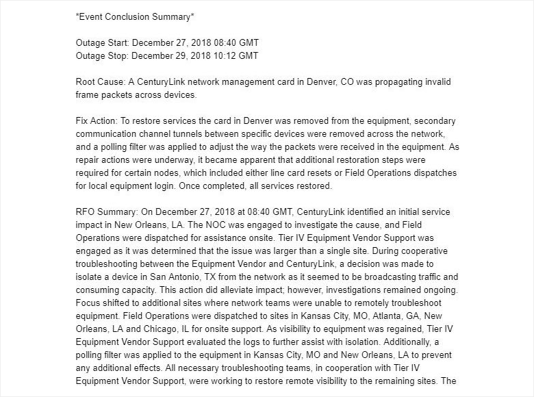 So what really happened? The official Reason For Outage (RFO) analysis from CenturyLink points to issues with a bad network management card in Denver, CO.