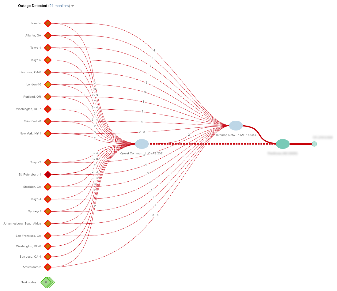 1. Visibility, Visibility, Visibility — You can never have too much visibility into the networks and services your employees and customers rely upon. The Internet is a mission-critical network and you need to know how it’s performing so that you can effectively mitigate outages like these. CenturyLink lost visibility into their optical switches which severely impaired their ability to diagnose and recover from the failure. However, their customers who had service resiliency and sufficient visibility were able to detect and route around the failure and preserve their services. Figure 3 below shows a BGP visualization from ThousandEyes where an enterprise has routed away from CenturyLink to another ISP.