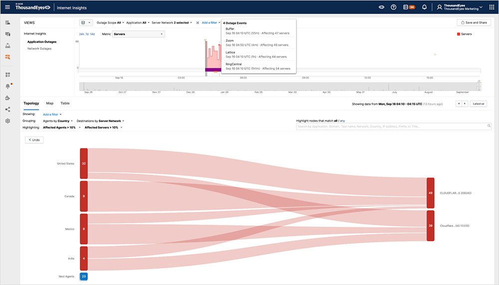 ThousandEyes actively monitors the reachability and performance of thousands of services and networks across the global Internet, which we use to analyze outages and other incidents. The following analysis of the Cloudflare outage on September 16, 2024, is based on our extensive monitoring, as well as ThousandEyes’ global outage detection service, Internet Insights. See how the outage unfolded in this analysis—more updates will be added as we have them.