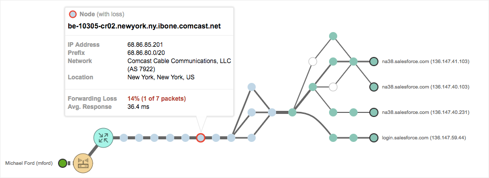 On Monday morning, November 6th 2017, from 9:45am-11:25am Pacific, Comcast suffered a nationwide outage sending several million users of the popular Internet Service Provider into a frenzy. Our analysis has revealed that Level 3 leaked over a thousand routes belonging to Comcast subsidiary networks and their customers. The immediate effect was that instead of traffic going through the Comcast backbone to reach these networks, traffic was forced to go via Level 3. The result for all the attempted communication was a significant spike in packet loss and latency, causing many Internet services and applications like Slack and Webex to become functionally unusable. In today’s era of interconnected networks and Internet reliant businesses, yesterday’s outage is yet another reminder of the complex dependencies and vulnerability of the Internet.