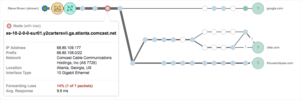 On Monday morning at 9:45am, we noticed that ThousandEyes employees connecting remotely through the Comcast network were unable to use productivity and collaboration tools like Slack, Gmail and Webex. At the time of the outage, we noticed multiple instances of packet loss within the Comcast network distributed across various regions. The impact of the outage was widespread across North America, equally impacting the east and the west coasts. ThousandEyes remote employees connecting from Chicago and Miami, monitoring services hosted outside of the Comcast network from Endpoint Agents on their laptops were consistently showing packet drops within the Comcast infrastructure in New York and Atlanta respectively, as shown in Figures 1 and 2.