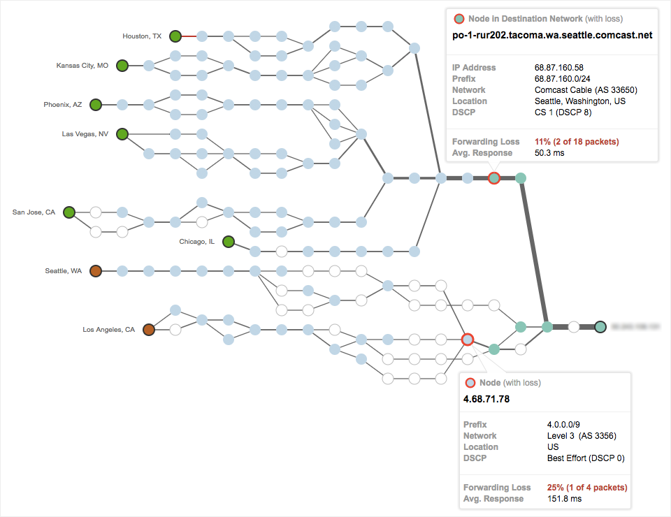 We also observed packet loss for a service hosted within the Comcast infrastructure. Figure 3 below shows packet loss within the Seattle/Tacoma Comcast network along with a spike in packet loss within the Level 3 network.