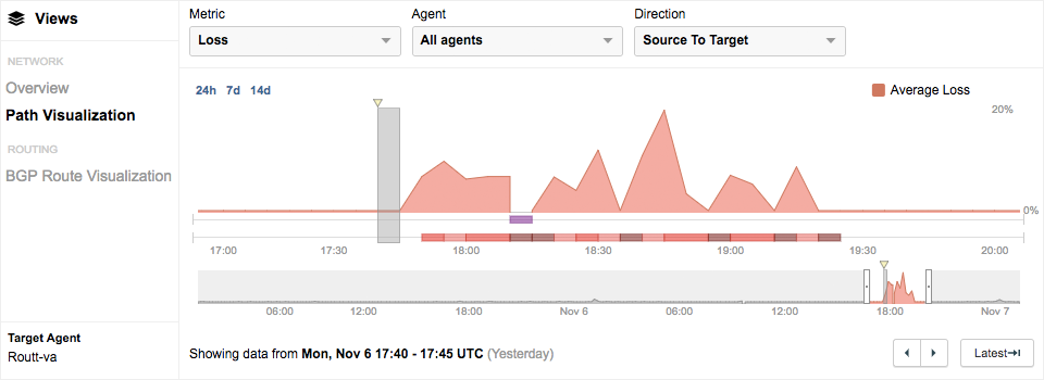 Beginning at 9:30am Pacific, tests targeting services within the Comcast network started witnessing inconsistencies in BGP routing, that manifested in the IP forwarding layer through Path Visualization. An Agent-to-Agent test targeting an Enterprise Agent hosted within the Comcast network began observing elevated amounts of packet loss during the time of the outage, as shown in Figure 4. To see the interactive data, feel free to explore this share link.