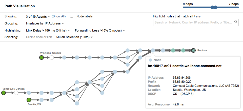 Right before the outage, as seen in Figure 5, we noticed that traffic from the Canada and Seattle Cloud Agents, destined to the Enterprise Agent located in Comcast network (AS 33650) traversed through the Comcast backbone AS 7922.