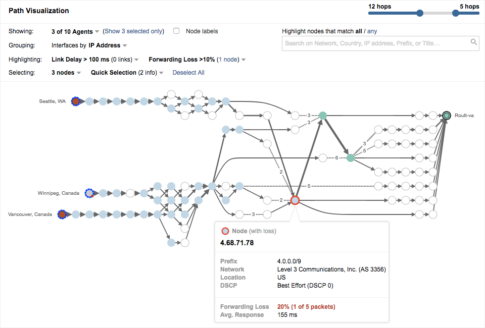 However, at the time of the outage, traffic from these agents located in Canada and Seattle were rerouted via Level 3, while being subjected to increased latency and a spike in packet loss, as shown in Figure 6.