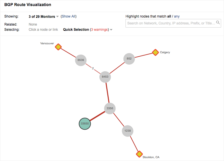 So why did traffic get rerouted via Level 3 ? Beginning at 9:30am Pacific, Level 3 (AS 3356) leaked more specific routes to the Comcast ASN 33650 which forced traffic through Level 3. Route leaks involve the illegitimate advertisement of prefixes, blocks of IP addresses, which propagate across networks. However, unlike BGP hijacks, BGP route leaks are not always malicious and are usually inadvertent and due to misconfigurations. Route leaks are prone to propagation when a more specific prefix is advertised.