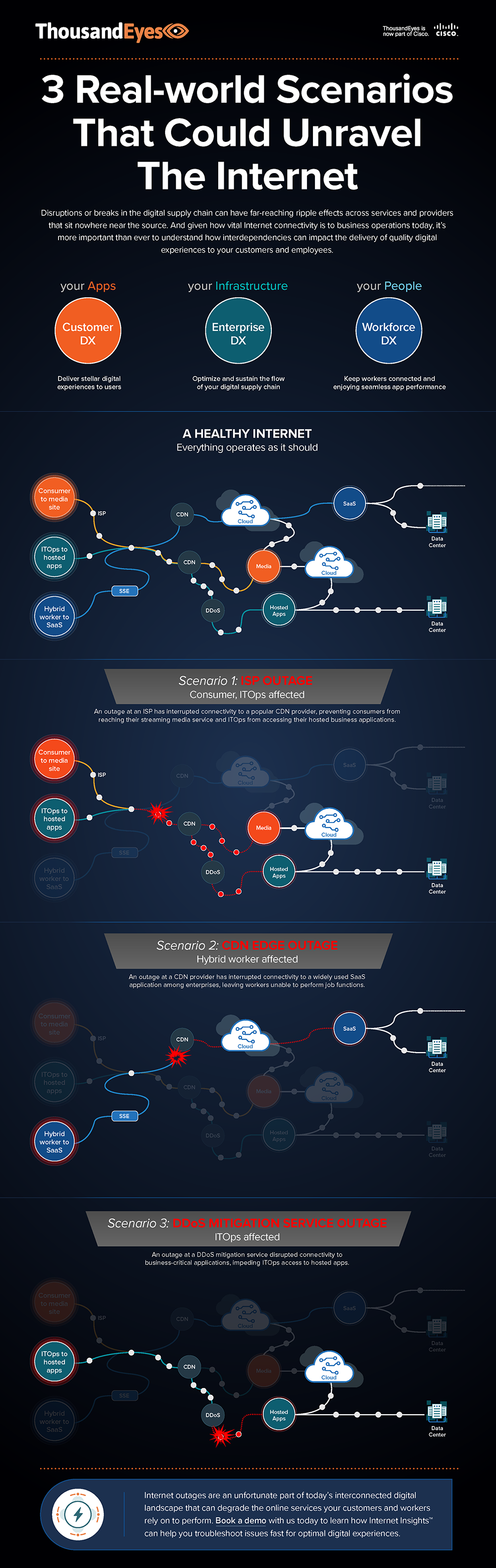 The Internet is a massive network of networks, made up of interdependent and interconnected services—from sophisticated public clouds to foundational services (like DNS) that keep the Internet running. It's a complex mesh that is often difficult to troubleshoot in real-time when major Internet outages occur. And, with a growing dependence on distributed systems in the workplace, organizations are becoming increasingly vulnerable to Internet disruptions originating from single points of failure.