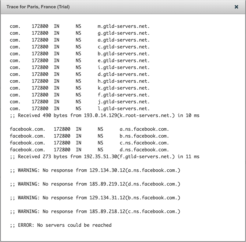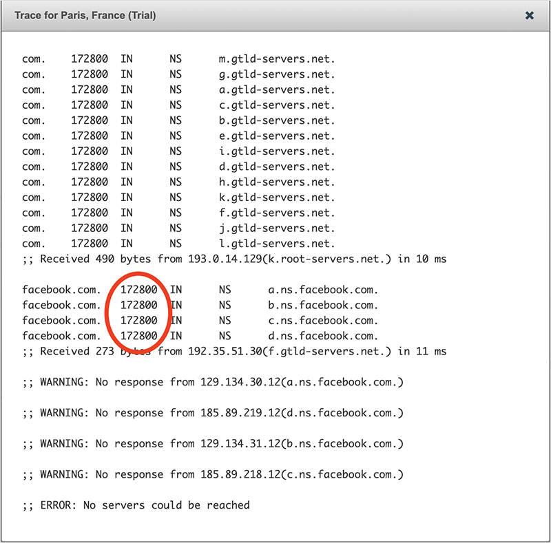 As this was happening, we could also see that queries through the DNS hierarchy for the facebook.com A record were failing due to Facebook’s nameservers becoming unreachable (see figure 3).