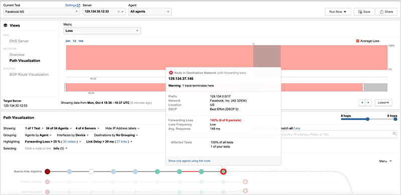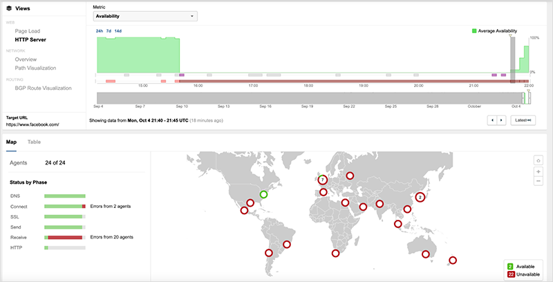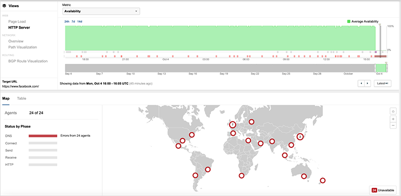 [Oct 4, 10:15 am PT] ThousandEyes tests can confirm that at 15:40 UTC on October 4, the Facebook application became unreachable due to DNS failure. Facebook’s authoritative DNS nameservers became unreachable at that time. The issue is still ongoing as of 17:02 UTC.
