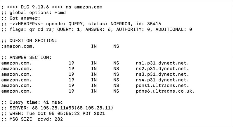 Not only does Amazon use external services to host its records, it notably uses two providers. Why is this notable? As a critical Internet infrastructure, DNS has, notoriously, been targeted for attack by malicious actors, as in the case of the massive DDoS attack on Dyn in 2016 or the route hijacking of Amazon’s DNS service Route 53 in 2018. By hosting with two different providers, Amazon can ensure that its site is reachable even if one of its providers were to be unavailable for whatever reason.