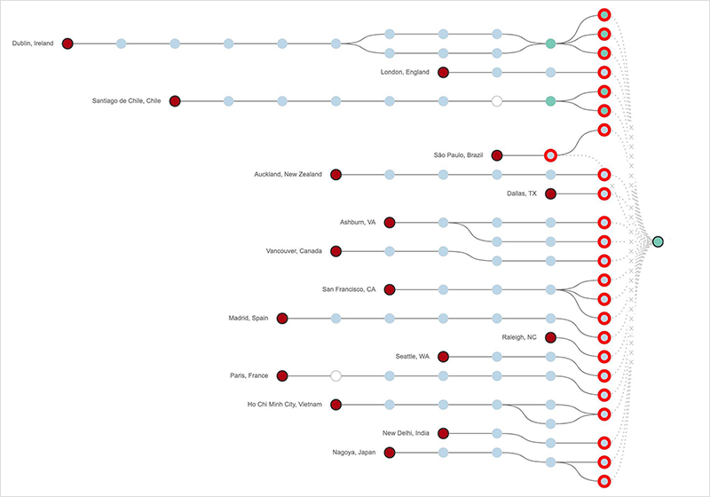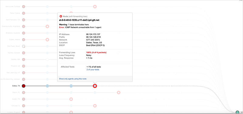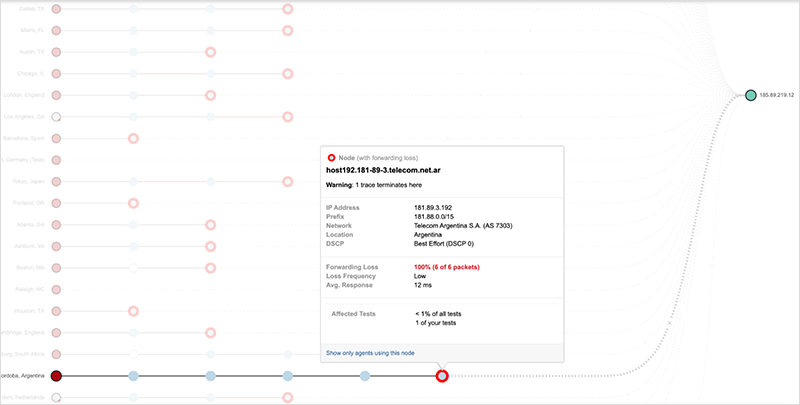 All of these prefixes covered Facebook nameservers, with the exception of the last one. Figure 6 shows traffic destined for nameserver ‘c’ getting dropped by the first Internet hop, as the service provider had no route in its routing table to get the traffic to its destination.