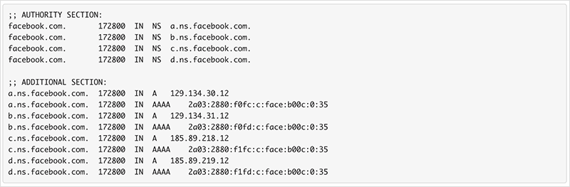 Nameserver records, which are served by top level domain (TLD) servers (in this case, com. TLD) can be long-lived records — which makes sense given that app and site operators are not frequently moving their records around — unlike A and AAAA records, which often change very frequently for major sites, as the DNS can be used to balance traffic across application infrastructure and point users to the optimal server for their best experience. In the case of Facebook, their nameserver records have a two day shelf life (see figure 5), meaning that even if they were to move their records to an external service, it could take up to two days for some users to reach Facebook, as the original nameserver records would continue to persist in the wilds of the Internet until they expire.