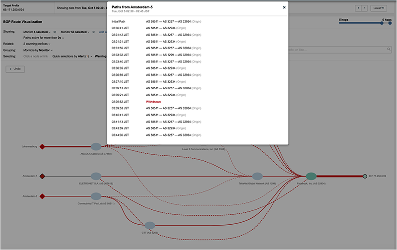 Moments before the outage, at approximately 15:39 UTC, Facebook issued a series of BGP route withdrawals covering hundreds of its prefixes — almost all immediately reversed — that effectively removed its DNS nameservers from the Internet. Depending on where Internet Service Providers sat on the Internet, they would have seen these route changes almost immediately or up to ten minutes later.