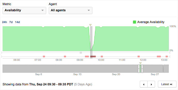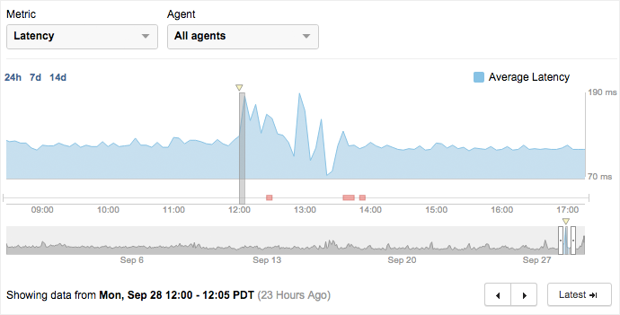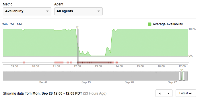 The most recent and most severe outage occurred on Monday Sept. 28th. It lasted for approximately 100 minutes, from 12:00pm to 1:40pm PDT. It affected users worldwide and for 40 minutes resulted in a complete outage from all 18 of our selected monitoring points, as seen in Figure 1. For the few users that could connect, page load times were well exceeding 10 seconds in many cases.