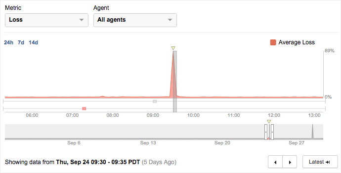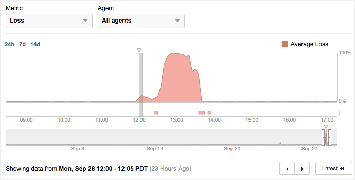 The September 17th was another short, approximately 10 minute outage, from 11:00am to 11:10am PDT. You can follow along with the interactive data for the Sept. 17th event https://vroyqvnbn.share.thousandeyes.com as well.
