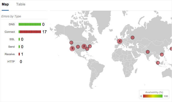 Figure 5 highlights the loss of availability and Figure 6 shows the extent of the issue. It’s global, affecting users from around the world, and manifests itself as a TCP connection failure, as you can see in the HTTP errors.