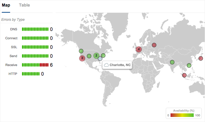 This outage appeared to be caused by issues in the HTTP receive phase, as data is transmitted back to users. This compares to a variety of errors in the first outage analyzed and TCP connection errors in the second event. In addition, the outage only affected some locations, rather than from all of our selected monitoring points. Connect, SSL and Wait times all were elevated, indicating issues with the Facebook application or dependent services. Figures 8 and 9 show the availability and errors.