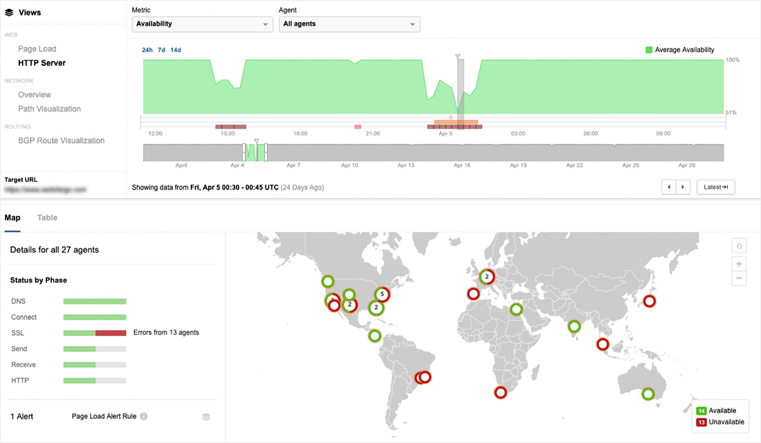 In addition, the team wanted to utilize a complementary toolset in order to baseline application performance, understand application behavioral characteristics and provide end-to-end application visibility. They chose to stitch together three perspectives of application performance using best-of-breed providers: ThousandEyes for the external or Internet view (Figure 1), Netscout for packet capture and wire-data analysis within their enterprise DMZ zone and AppDynamics for the internal view. Using these three tools, they can gain a good understanding of KPIs for performance and, subsequently, receive alerts when performance suffers.
