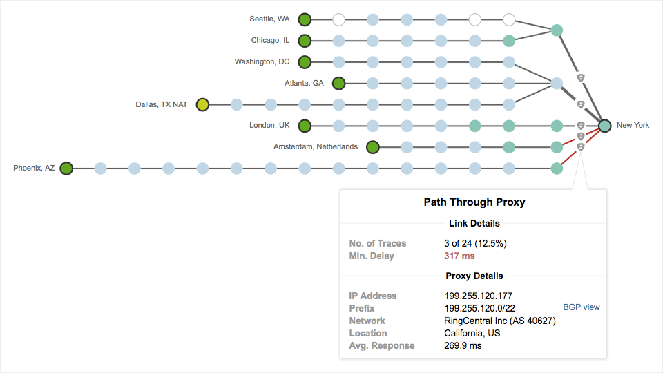 - Coverage of on-premises UC and UCaaS deployments. ThousandEyes visibility doesn’t end at your corporate network borders like most other solutions. Instead, network path visualization and root cause identification extend across the Internet to your UCaaS provider, including BGP routing analysis. Your insight can even leverage collective intelligence.