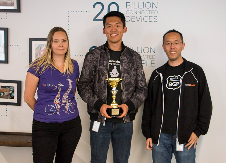 So, this is how Hackday works. A week before the main event, anyone with an idea does a Hackday pitch to the entire company. The pre-event pitch serves as a forum to recruit team members and get the project in motion. Teams are then given one day to work on their projects before presenting it to a panel comprised of the ThousandEyes executive team. Finally, the panel picks a winner in five different categories (Most Innovative Idea, Most Flashiest Idea, Most Nerdiest Idea, Super Star and Founder’s Choice). We also have a sixth category, called the People’s Choice, where the entire company votes for their favorite Hackday project.
