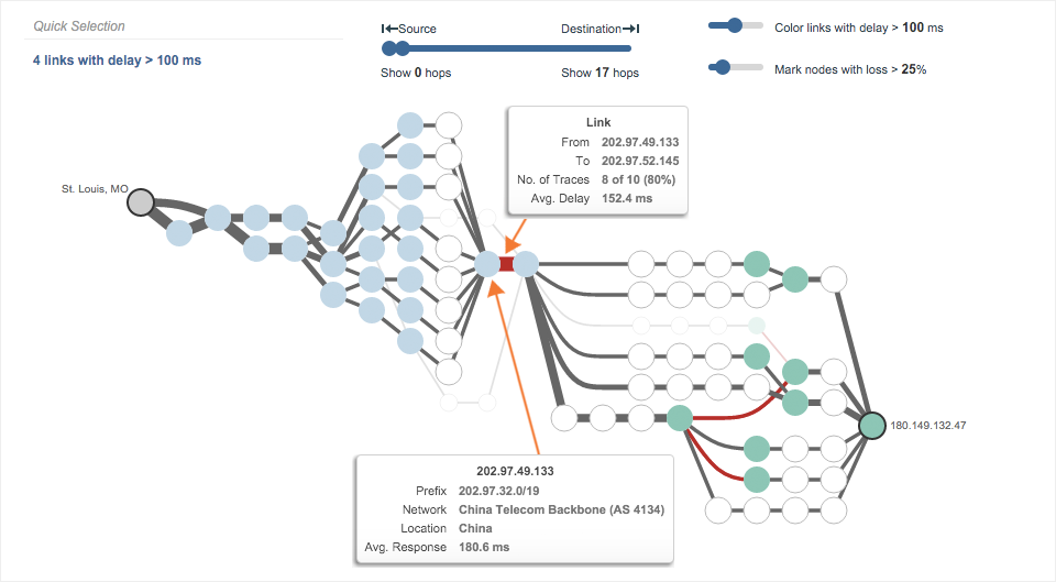 The Chinese government controls all eight of the ISPs in the country, in addition to all ten of the international Internet gateways through which traffic travels between China and the rest of the world. In Figure 1, traffic flows from our St. Louis agent to the destination, baidu.com. The paths converge at a “narrow waist,” one of the Internet gateways in China Telecom. The link directly upstream observes a significant average delay time of 152.4 ms, which is likely due to the process of filtering traffic associated with passing through the Great Firewall.