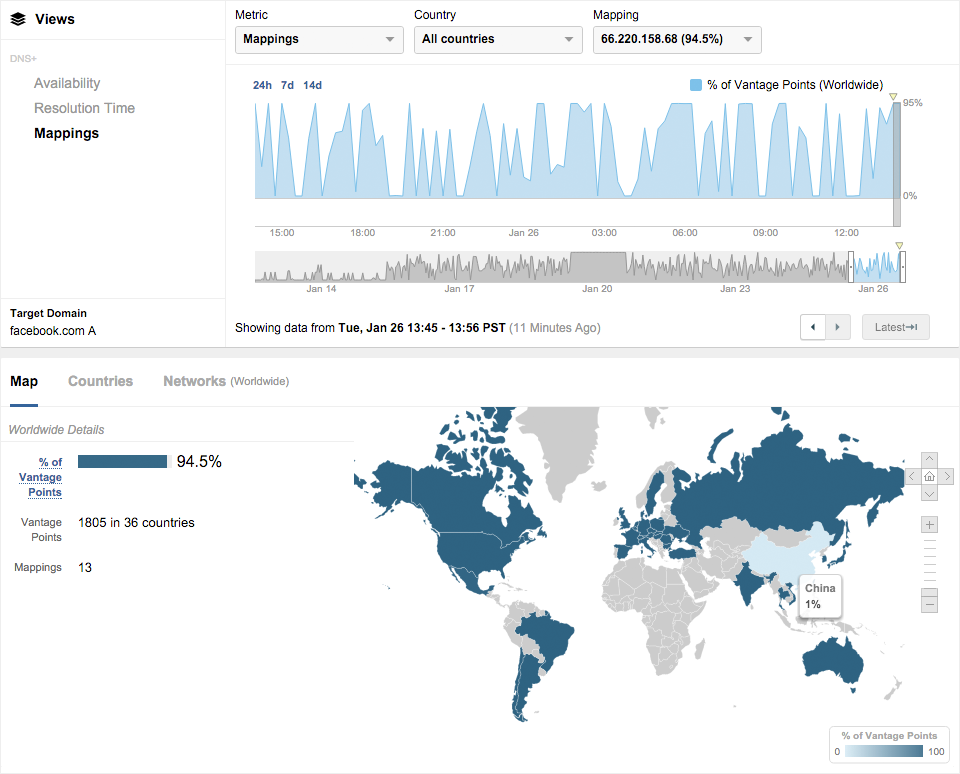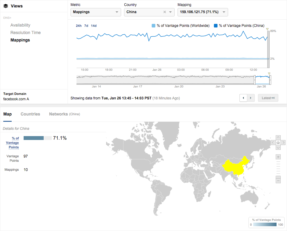 a mapping to 66.220.158.68, though only 1% of vantage points in China do so.