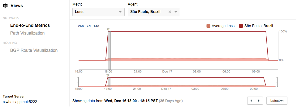 The service went down on December 16 at midnight and came back online 16 hours later after a second judge ruled that the punishment seemed unreasonable. Figure 4 shows the 100% loss that our Sao Paulo agent—and no other agent—observed. If you prefer more interactive data, follow along at our share link.