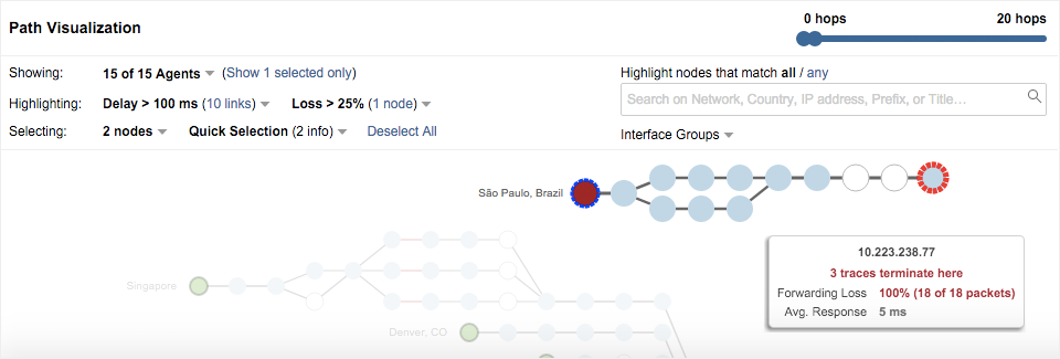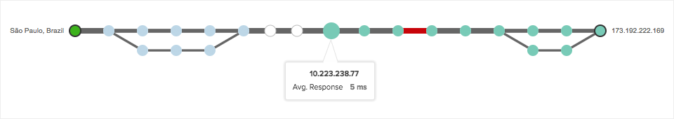 If we go back to the point in time right before the block was instituted, we see that the same node at 10.223.238.77 is still traversed, and that the path downstream remains unchanged. To get a sense of the path, feel free to interact with the path visualization below. In addition, there were no BGP path changes throughout the duration of the entire outage. The fact that the path didn’t change when WhatsApp was blocked rules out the possibility of any DNS-related tactics that redirect traffic to the wrong address. It’s most likely that Brazil’s ISPs simply blocked WhatsApp’s IP addresses so that routers, armed with an IP blacklist, would drop all packets destined for WhatsApp’s IPs. In the case of our Sao Paulo agent, the router dropping packets was located at 10.223.238.77.